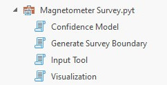 1.Input Tool: Imports raw data file into an ArcGIS file geodatabase via a defined feature class schema. Plots the sample point features (rawGamma) which are used to generate tracklines (surveyLines). Establishes attribute table values for each sample to include total field magnetic value, altitude, date, time, and survey run line name.